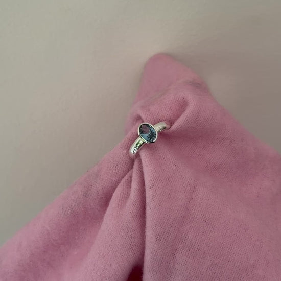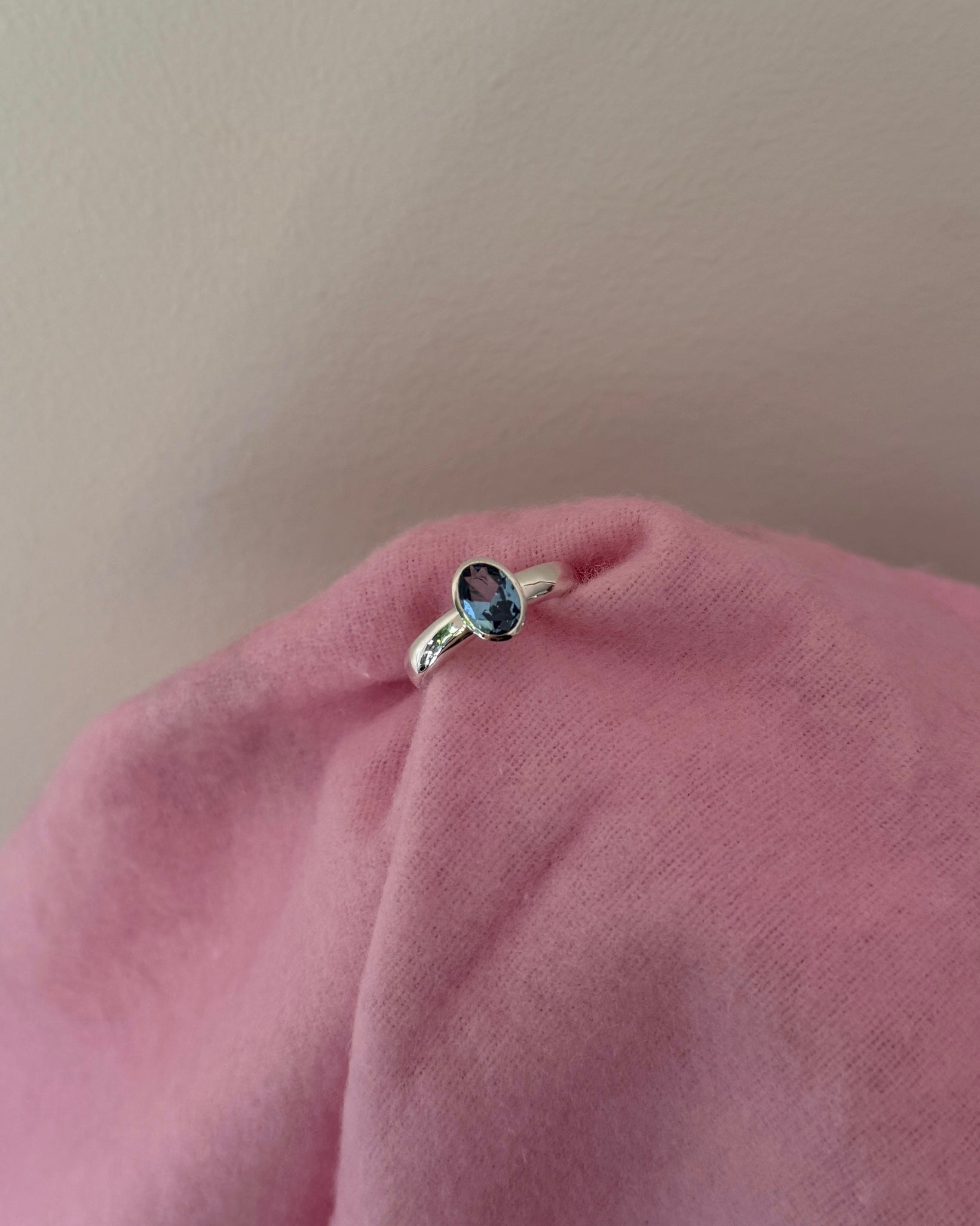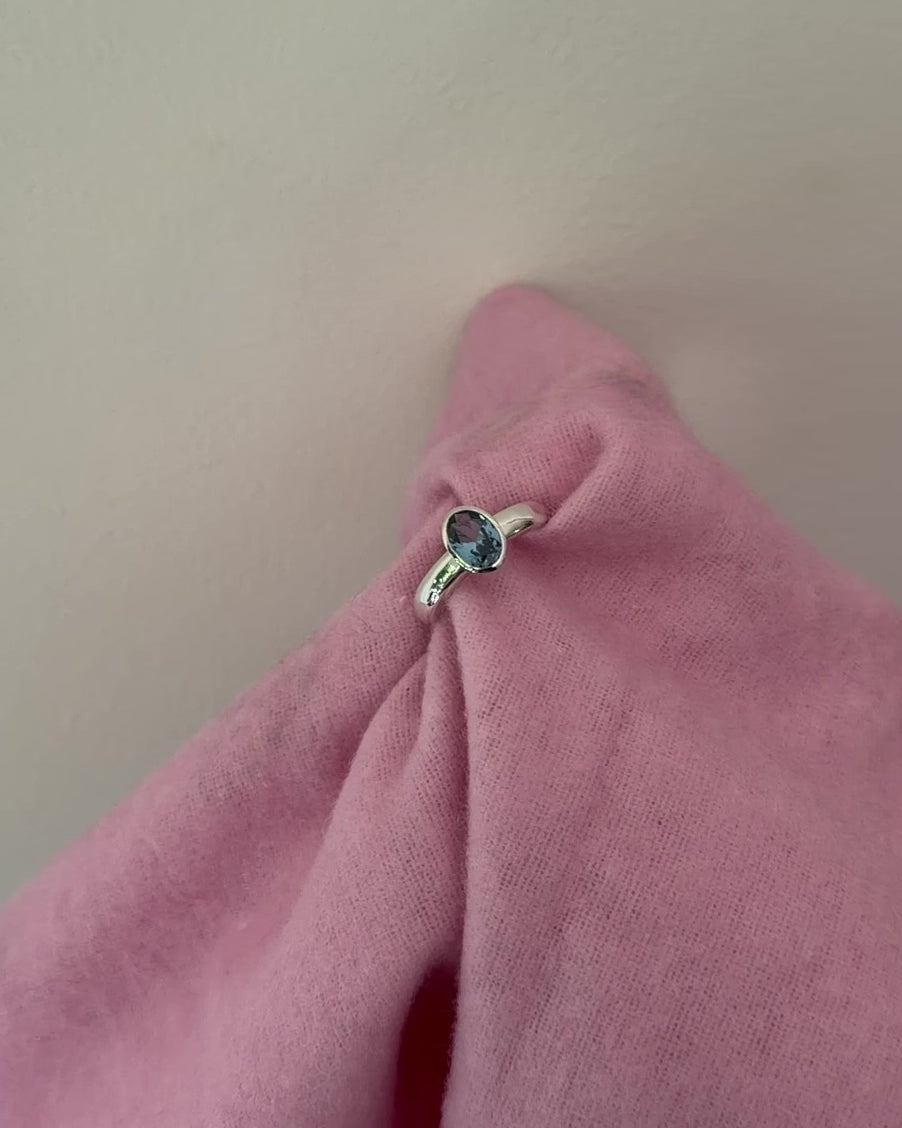 One-off bezel set ring in solid sterling silver with an 8x6mm lab grown blue zircon.